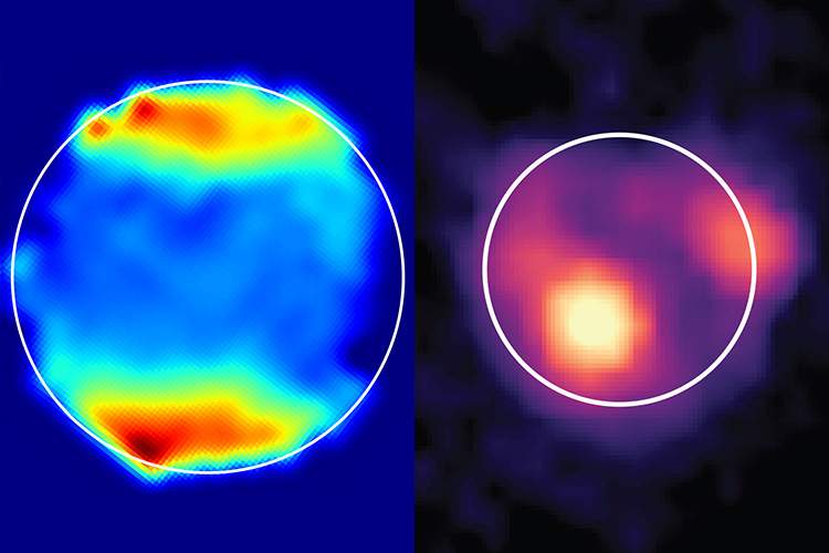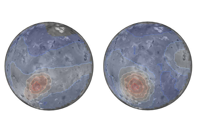 Спектроскопическая карта Ганимеда (слева), полученная с помощью аппарата «Уэбб», показывает поглощение света в районе полюсов, характерное для перекиси водорода. Справа — инфракрасное изображение Ио, на котором видны извержения горячих вулканов. Авторы: Саманта Трамбо, Корнелл, и Имке де Патер, Калифорнийский университет в Беркли.