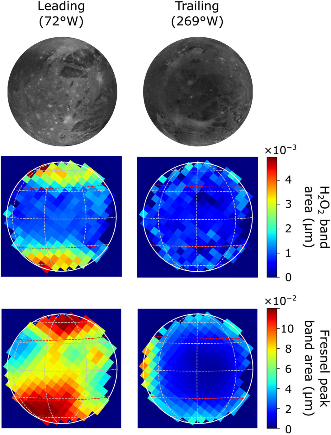 В первом исследовании астрономы описывают обнаружение перекиси водорода в районе полюсов Ганимеда. Эта молекула (H2O2) была обнаружена благодаря измерениям NIRSpec (Near InfraRed Spectrometer) и, по мнению ученых, возникла в результате воздействия заряженных частиц на ледяную поверхность спутника. Второе исследование, напротив, показывает обнаружение серных паров на Ио, на что также повлияла близость к газовому гиганту.