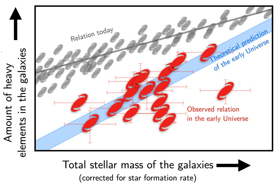 Обычно чем массивнее галактика, тем тяжелее элементы. Однако последние наблюдения, похоже, ставят эту взаимосвязь под сомнение. Каспер Эльм Хайнц поясняет в пресс-релизе: «Проанализировав свет от 16 ранних галактик, мы обнаружили, что они содержат гораздо меньше тяжелых элементов, чем можно было бы ожидать, исходя из их звездных масс и количества новых звезд, которые они произвели».