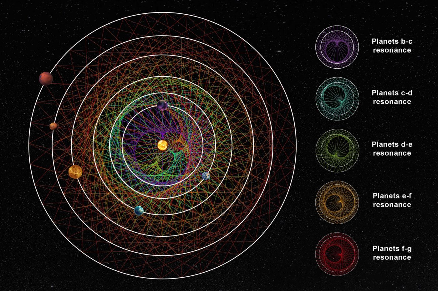 В этой системе самая удаленная планета совершает одну орбиту одновременно с шестью орбитами ближайшей планеты. Остальные четыре планеты следуют по аналогичным орбитам, создавая идеально скоординированный космический танец.