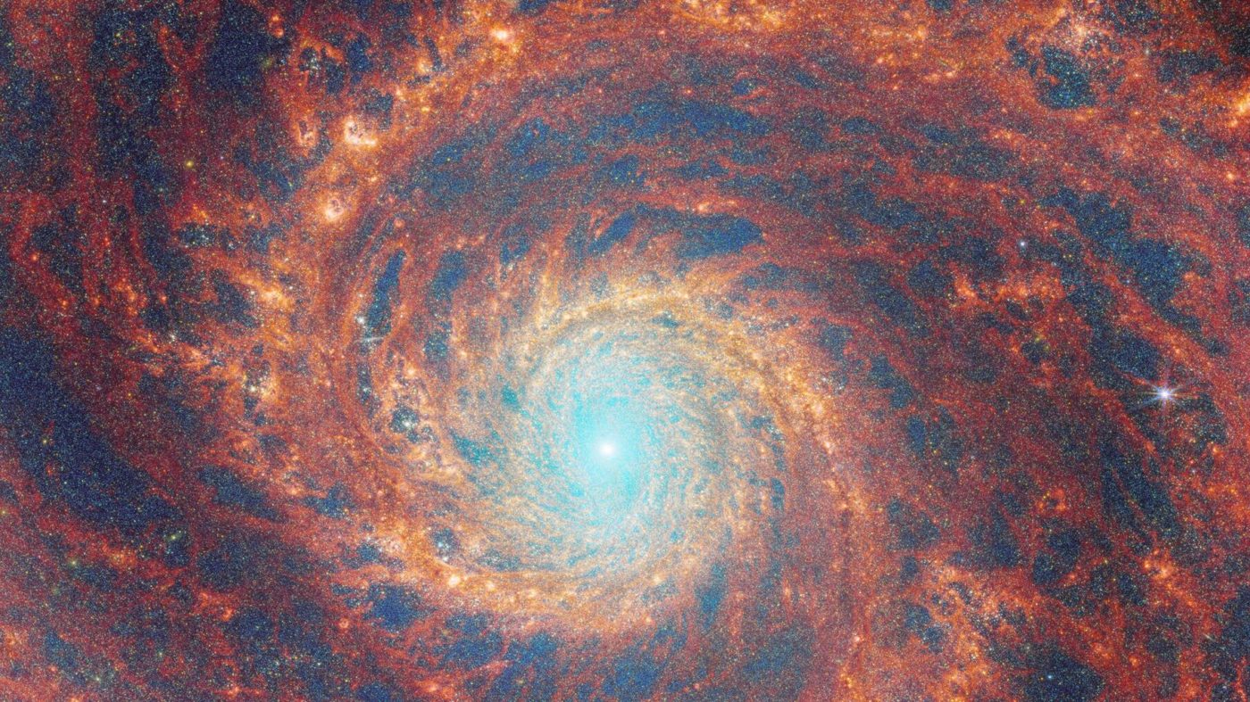 Недавно исследователи использовали время наблюдений на телескопе Джеймса Уэбба для изучения объекта в инфракрасном свете. Новое изображение содержит данные, полученные с помощью приборов NIRCam и MIRI телескопа, которые демонстрируют невероятную детализацию и раскрывают скрытые особенности. В частности, мы видим горячую пыль, сконцентрированную вдоль спиральных рукавов (темно-красные области внизу).
