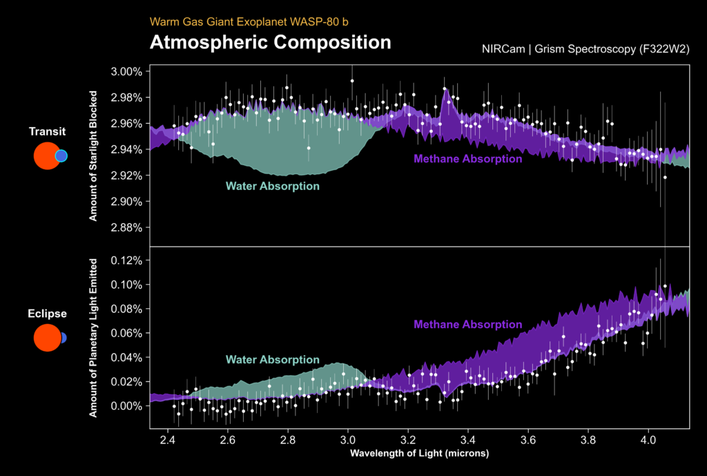 Теперь «Уэбб» обнаружил метан в атмосфере другой экзопланеты — WASP-80 b. В спектрах, полученных с помощью NIRCam, обнаружены признаки метана и водяного пара. И если водяной пар исследователи обнаружили по меньшей мере у десятка внесолнечных планет, то метан до недавнего времени обнаружить не удавалось. Напомним, что метан — это молекула, в изобилии присутствующая в атмосферах Юпитера, Сатурна, Урана и Нептуна в нашей Солнечной системе.