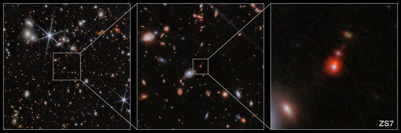 Однако «Джеймсу Уэббу» удается их обнаружить благодаря прибору NIRSpec (Near InfraRed Spectrometer). Наблюдения, проведенные в рамках программы Galaxy Assembly with NIRSpec Integral Field Spectroscopy, с использованием техники интегральной полевой спектроскопии позволили проанализировать характеристики галактической системы ZS7.