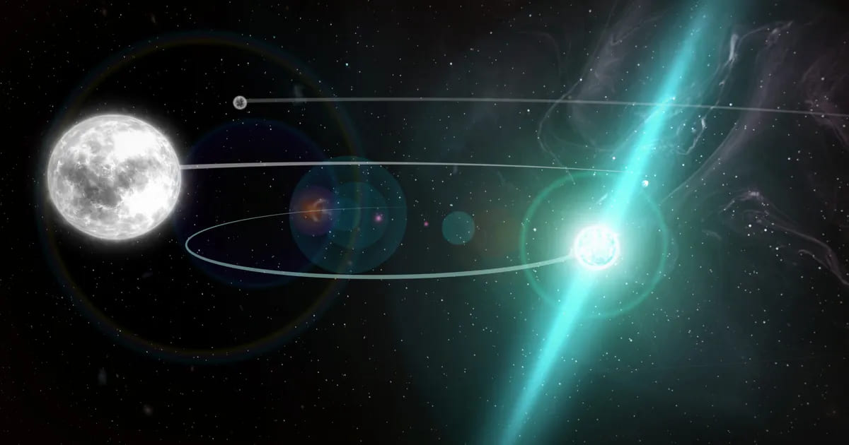PSR J0337+1715, расположенный примерно в 1000 световых лет от Земли, — особенно интересный пульсар. Он уникален тем, что является частью сложной бинарной системы, вращающейся вокруг не одной звезды, а двух белых карликов (мертвых звезд, у которых закончилось ядерное топливо и они больше не способны к термоядерным реакциям).