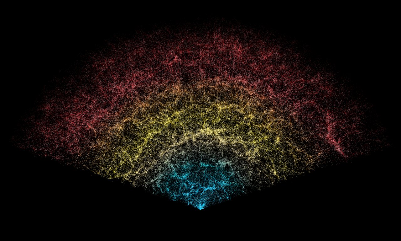 Чтобы составить карту космоса, DESI собирает свет от миллионов галактик на более чем трети всего неба. Разложив свет от каждой галактики по цветовому спектру, DESI может определить, насколько свет был смещен в результате расширения Вселенной за миллиарды лет, которые он прошел, прежде чем попасть на Землю. Как правило, чем больше красное смещение, тем дальше галактика.