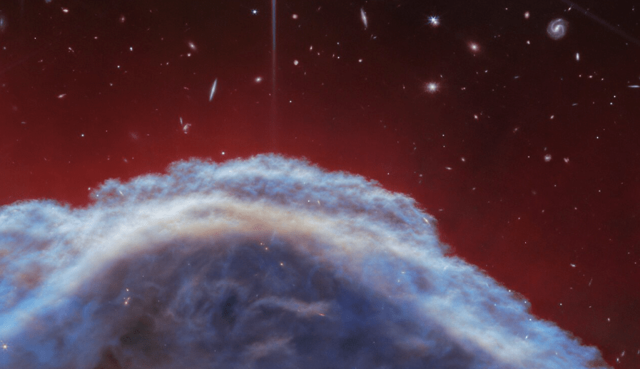 Верхняя деталь туманности Конская голова, полученная в среднем инфракрасном диапазоне с помощью MIRI (слева) и в ближнем инфракрасном диапазоне с помощью NIRCam Уэбба (справа). Над туманностью видны звезды и далекие галактики. Предоставлено: NASA