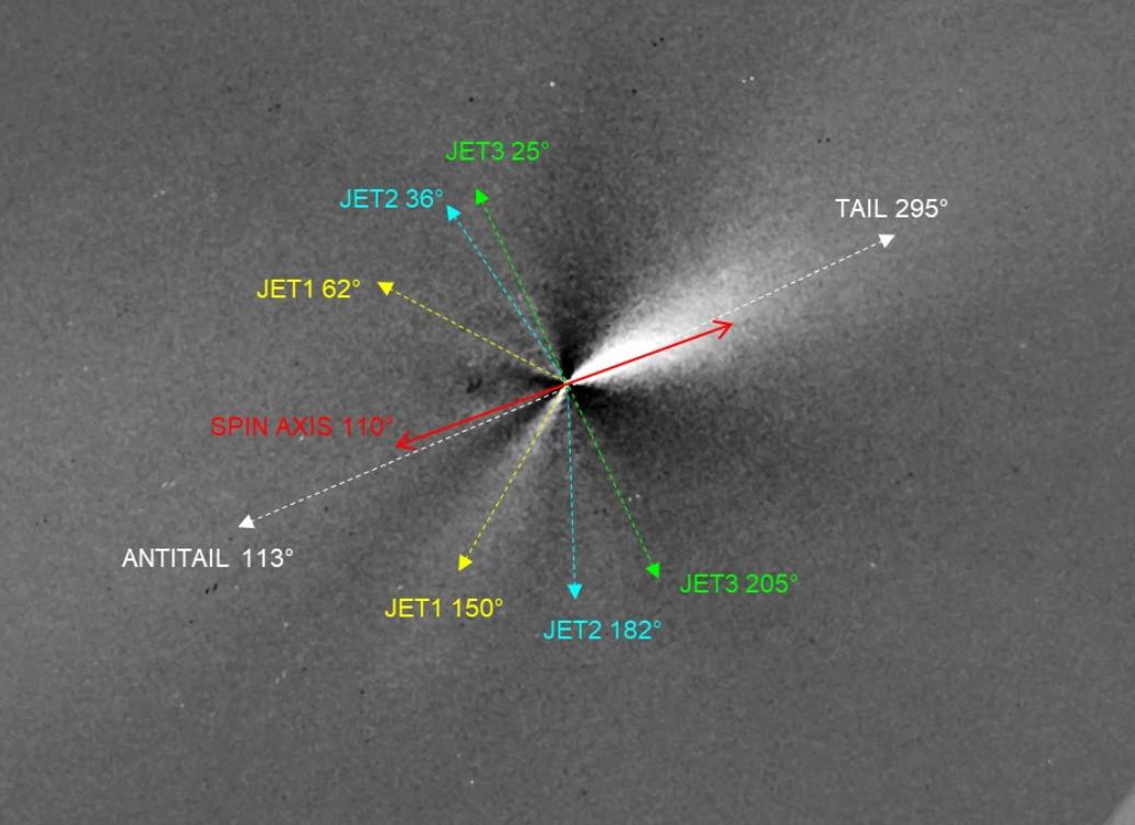 Более детальный анализ внутренней комы с применением специальных фильтров (1/r и Ларсона-Секанина) выявил наличие шести слабых прямых струй (джетов), истекающих из ядра кометы. Эти струи теряют свою чёткую форму уже на расстоянии нескольких тысяч километров из-за рассеяния пыли. Учёные установили, что струи образуют три симметричные пары относительно предполагаемой оси вращения ядра. Каждая такая пара, вероятно, представляет собой два края конуса выброса вещества из активной области на вращающейся поверхности ядра.