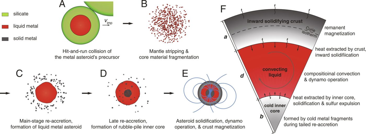 С помощью моделирования Чжан совместно с Берковичи продемонстрировал, что после столкновения астероидов возможно образование новых железо-тяжелых астероидов с холодным внутренним ядром, образованным кучей обломков, окруженным более горячим жидким внешним слоем. Когда холодное ядро начинает отбирать тепло из внешнего слоя и выделяются более легкие элементы, такие как сера, начинается конвекция, которая, в свою очередь, создает магнитное поле. Ниже приводится схема этого процесса.