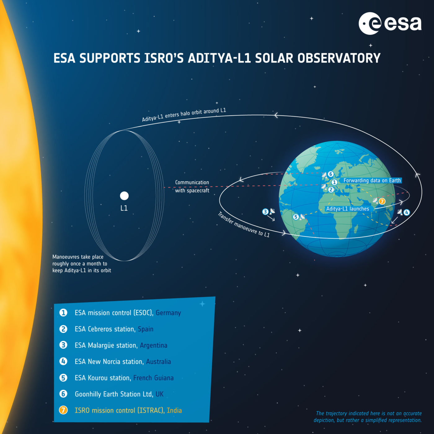 Станции ЕКА будут поддерживать миссию от начала до конца: на критическом этапе запуска, во время полета к L1, а затем в течение последующих двух лет регулярной работы будут передавать команды и получать научные данные с Aditya-L1 в течение нескольких часов в день.
