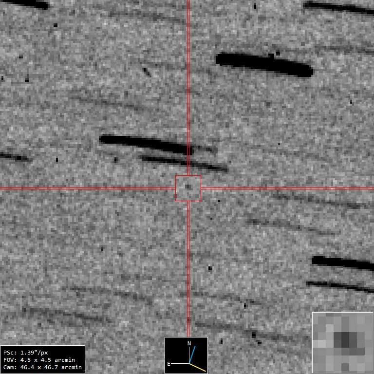 Изображение, полученное OGS (на обложке), представляет собой комбинацию из 90 отдельных снимков с 36-секундной экспозицией каждый. Они были наложены и обработаны с учетом движения зонда, который движется не по прямой линии. Именно этому мы обязаны искривлением и деформацией звезд, видимых на заднем плане.