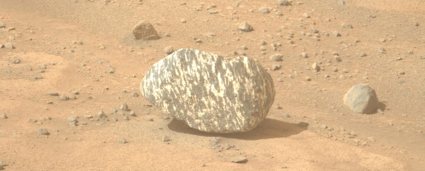 Марсоход НАСА Perseverance, работающий на Марсе с февраля 2021 года, недавно сделал интригующее открытие в кратере Езеро: странный камень с черно-белыми полосами, прозванный «Замком Фрейи». Эта находка восхищает ученых, поскольку она имеет текстуру и внешний вид, никогда ранее не встречавшиеся на Красной планете.