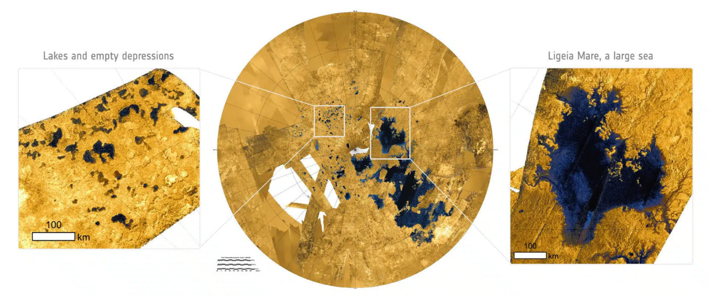 Мы также знаем, что поверхность Титана покрыта огромными пространствами темных дюн, образованных органическими частицами. Помимо этих дюн, на Титане находятся огромные моря и озера из жидкого метана и этана, которые представляют собой уникальный ландшафт.