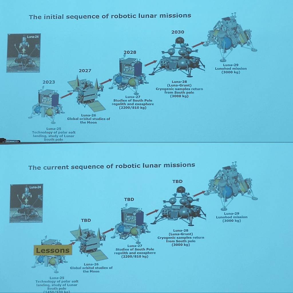 На проходящей в настоящее время в Баку выставке МАК 2023 в ходе дискуссии, посвященной российским лунным исследованиям, представитель Роскосмоса продемонстрировал слайд (на фото выше), связанный с лунной программой. На нем видно, что все сроки, на которые первоначально планировались лунные миссии в этом десятилетии, в настоящее время пересматриваются. Таким образом, неудача с полетом «Луны-25» не только ставит российскую программу в кризисное положение, но и рискует поставить под серьезную угрозу участие в программе ILRS под руководством Китая.