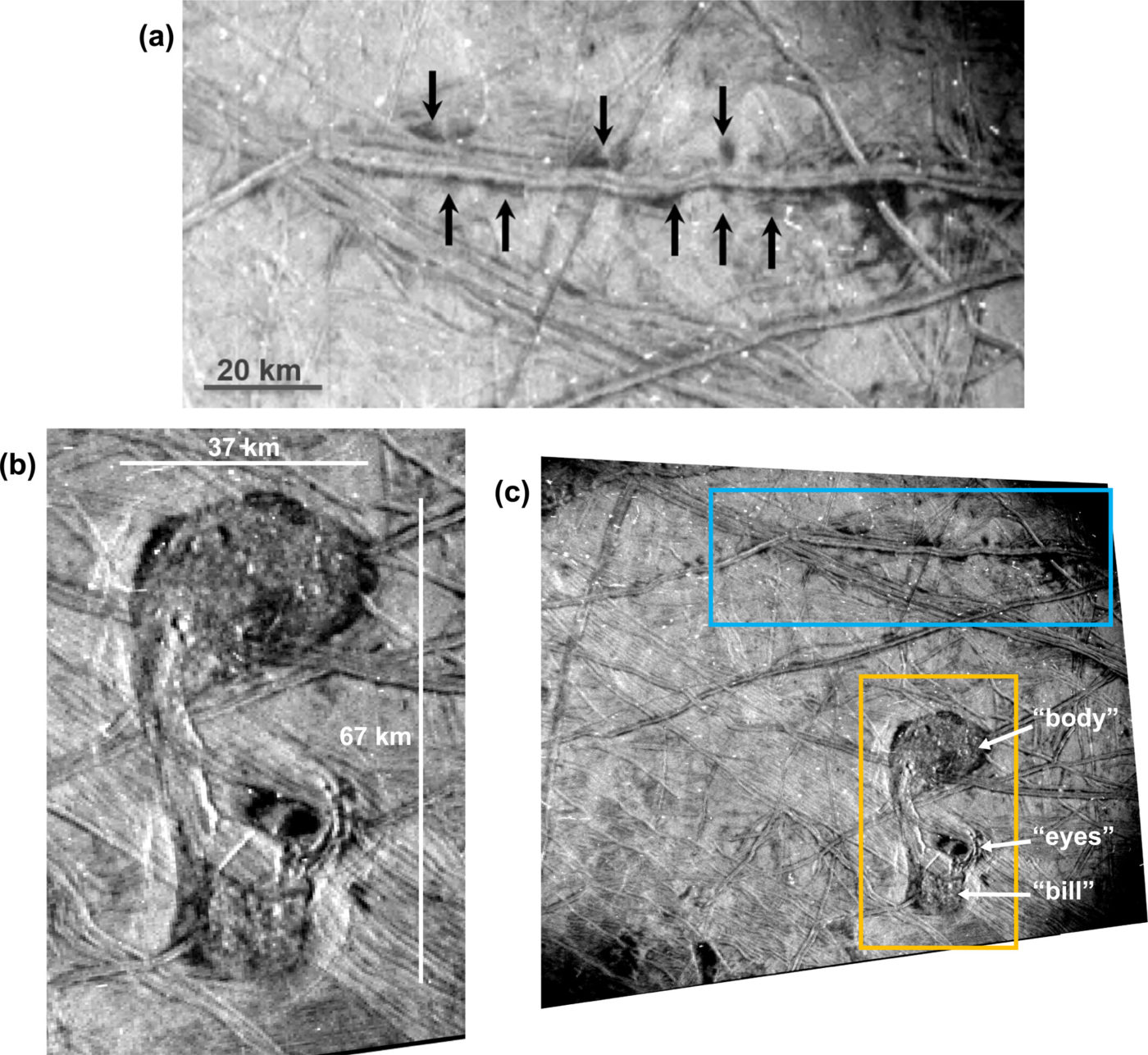 Команда «Юноны» считает, что эти образования подтверждают идею о том, что ледяной панцирь Европы может разрушаться в местах, где под поверхностью находятся карманы с соленой водой из подповерхностного океана. Примерно в 50 километрах к северу от «утконоса» находится серия двойных хребтов, окруженных темными пятнами, похожими на те, что встречаются на других участках Европы, и ученые предполагают, что это отложения криовулканических плюмов.