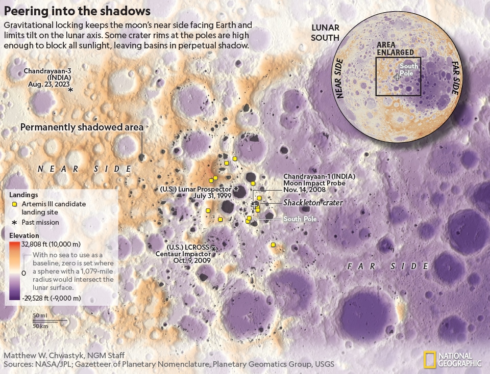 Эти технологические достижения открыли новые перспективы в изучении Луны, позволив ученым более точно планировать миссии и нацеливаться на конкретные области, представляющие интерес для исследования и изучения. Вместе с мозаичным изображением кратера Шеклтон National Geographic опубликовал топографическую карту южного полюса Луны с указанием потенциального места посадки «Артемиды-3» в этом регионе.