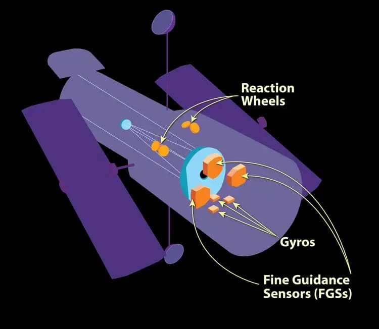 Поскольку у Хаббла нет ракетных двигателей для ориентации, он использует свои внутренние двигатели, или реактивные колеса, которые вращаются, придавая импульс, на который остальные части аппарата реагируют, «толкаясь» в противоположном направлении, создавая вращение. Однако если «Хаббл» не будет точно знать, куда он направлен, он неправильно сфокусирует свои цели. Поэтому гироскопы действуют как сверхточная система балансировки, помогая телескопу двигаться как можно точнее.