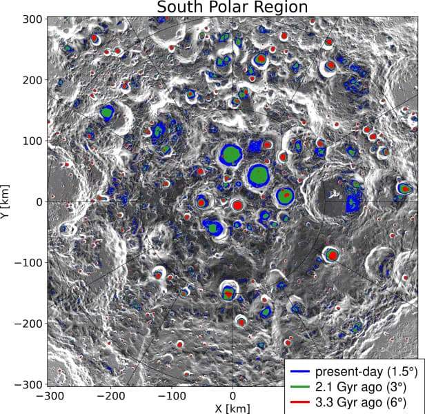 Возникновение и существование постоянно затененной области на Луне зависит, в частности, от оси вращения нашего спутника. Если угол ее наклона меняется, то солнечная радиация в определенных областях может перестать быть касательной, освещая эту область и растапливая ее лед.