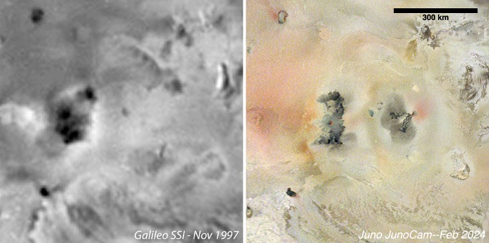 На последних снимках Juno, напротив, видны многочисленные изменения. Среди них — крупный вулканический объект сложной формы, «который, похоже, образовался из ничего с 1997 года», — прокомментировал Майкл Рэвин. Равайн — руководитель перспективных проектов в компании Malin Space Science Systems, Inc, которая спроектировала, разработала и эксплуатирует камеру JunoCam.