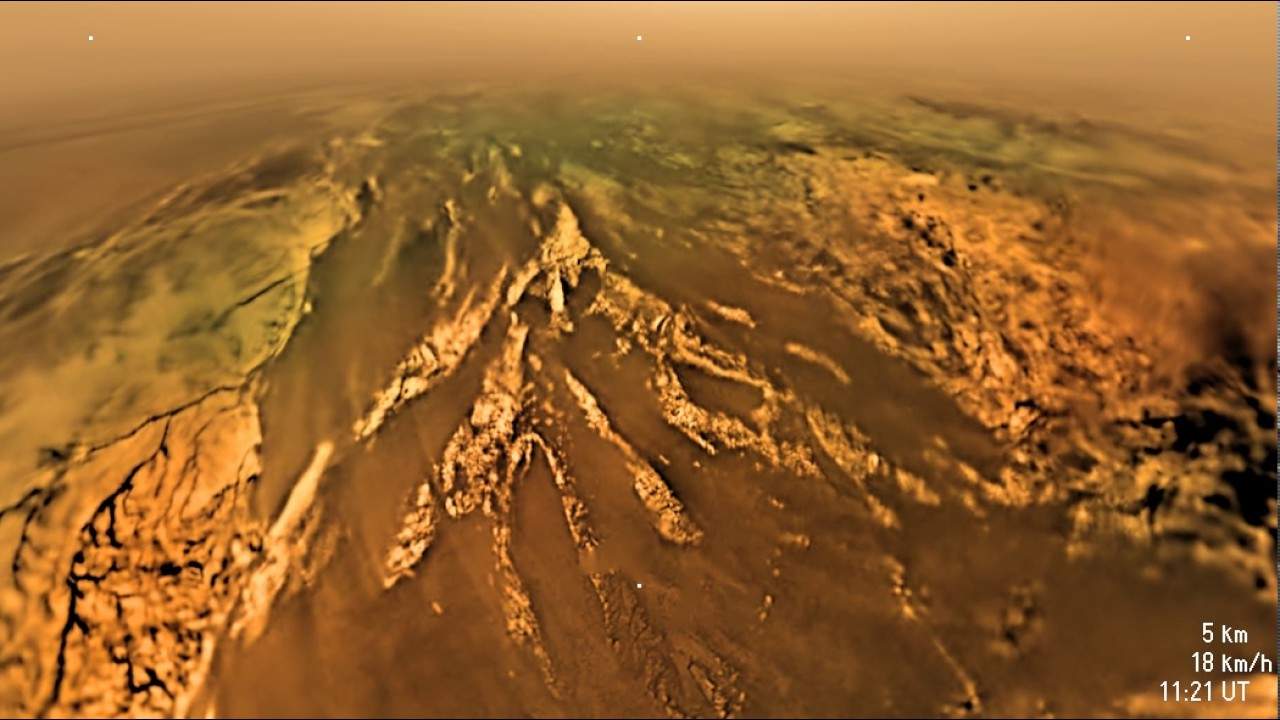Ниже представлено одно из первых необработанных изображений, полученных зондом во время спуска. Оно было сделано с высоты 16,2 км с разрешением около 40 м на пиксель. На снимке изображена сложная сеть дренажных каналов, пересекающих сушу и ведущих к береговой линии, очерчивающей светлый ландшафт в направлении темного моря. Снимок был сделан с помощью спускаемого имиджера/спектрального радиометра, одного из двух приборов НАСА на зонде.