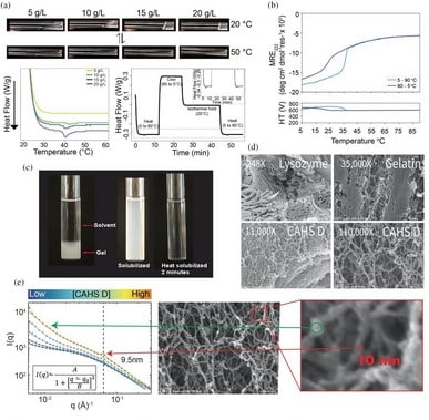 Белок CAHS D образует гель, который иммобилизует и стабилизирует биологический материал in vitro. (a) Концентрационная и температурная зависимость гелеобразования CAHS D. (b) Термическая денатурация и охлаждение структуры белка CAHS D. (c) Разбавление 10 г/л (0,4 мМ) геля CAHS D в 20 мМ Трис-буфере приводит к разрешению примерно за 2 минуты при 55 °C. (d) СЭМ-изображения лизоцима (фермента), желатина и CAHS D. Ретикулярные гели CAHS D похожи на белок желатина, но отличаются от гелей лизоцима — негелевого белка. (e) Зондирование гелей CAHS D при различных концентрациях выявило появление структуры размером около 9,5 нм. На увеличенном СЭМ-изображении в области красной подписи показано волокно шириной около 10 нм, что хорошо соответствует пику, возникающему при увеличении концентрации на графике МРРЛ (показан красной стрелкой и черной пунктирной линией). Зеленая стрелка подчеркивает изменение внутреннего пустотного пространства в пределах одного волокна.
