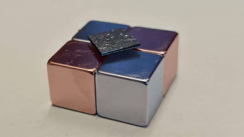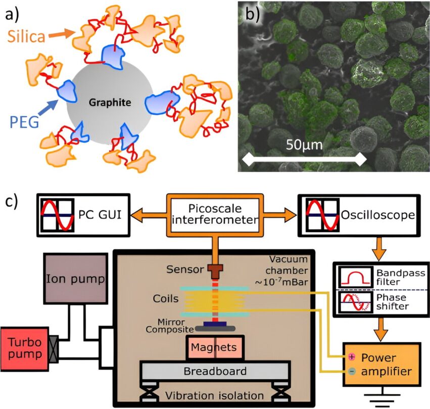 «Изолирующее покрытие снижает затухание вихревых токов почти на порядок по сравнению с графитом без покрытия при том же размере частиц«, — объясняют исследователи в своем отчете. Полученный материал представляет собой тонкую квадратную пластину площадью один сантиметр, левитирующую над магнитами, расположенными в виде решетки.