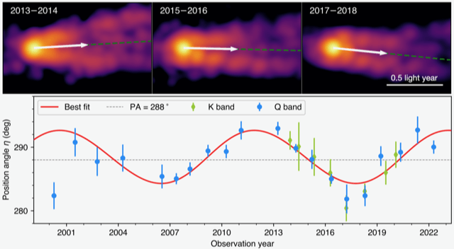 Верхняя панель: структура струи M87 с частотой 43 ГГц, наблюдения в 2013-2018 гг. Белые стрелки указывают угол положения струи на каждом подграфике. Нижняя панель: Результаты, основанные на ежегодном суммировании изображений с 2000 по 2022 год. Зеленая и синяя точки получены из наблюдений на частотах 22 ГГц и 43 ГГц соответственно. Красная линия представляет собой наилучшее соответствие согласно модели прецессии.