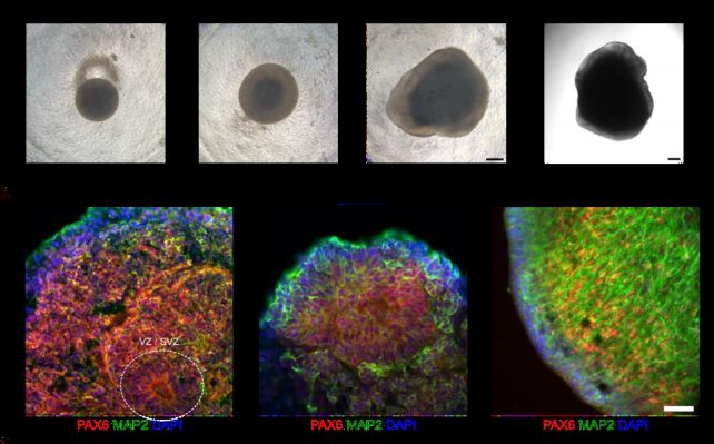 Слева направо вверху: органоиды мозга человека через 7 дней, 14 дней, 28 дней и несколько месяцев; Внизу слева направо: детали ткани головного мозга через 1, 2 и 3 месяца.