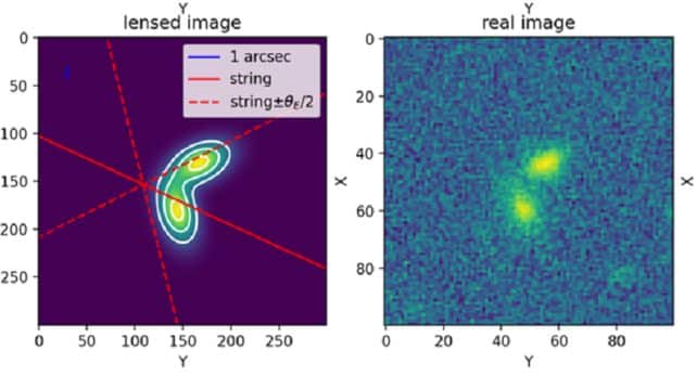 Согласно отчету, предварительно опубликованному на платформе , результаты наблюдений и моделирования указывают на высокую вероятность присутствия космической струны. На самом деле эта пара была бы одной и той же галактикой, отраженной для наших глаз в космосе под действием гравитационного линзирования, создаваемого потенциальной космической струной. Вблизи галактики пространство-время резко изгибается в сторону самой плотной зоны, то есть в сторону струны. Если провести аналогию, это похоже на размещение тяжелого предмета в центре батута. Когда свет от этой галактики проходит через эту область, он отклоняется и создает зеркальный эффект. С точки зрения удаленного наблюдателя в результате получаются два объекта.