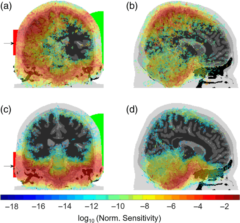 Карта чувствительности для положения источника, приблизительно соответствующего экспериментальным условиям [(a) и (b)], и на 40 мм ниже экспериментальных условий [(c) и (d)]. Область детектора представляет собой пересечение сферы (зеленого цвета) и поверхности головы.