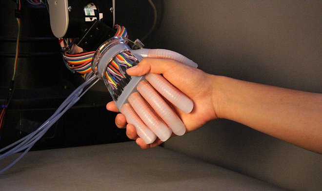 Большинство ныне действующих роботизированных конечностей, имитирующих человеческую руку, весьма громоздки и почти не обладают чувствительностью. Группа исследователей Корнельского университета во главе с доцентом кафедры механической и аэрокосмической техники Робертом Шепардом сумела наделить мягкого робота способностью ощущать предметы, подобно людям.