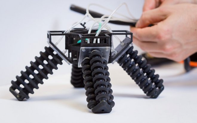 Большинство деталей робота были напечатаны на 3D-принтере. Ноги крепятся к жесткому корпусу и имеют внутри несколько полых камер из резиноподобного материала. Движение ног регулируется попеременной подачей воздуха в камеры. Робот может ходить со скоростью 20 мм/сек. Пока он подключен к воздушному насосу, но уже в скором времени ученые обещают сделать его автономным.