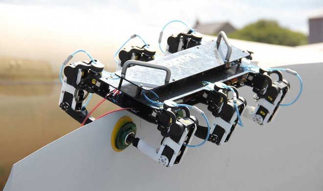 Возможная альтернатива этой опасной работе – использование роботов, подобных BladeBUG. По лопастям турбин он передвигается с помощью шести лап с вакуумными присосками, попутно сканируя их поверхность на предмет трещин и деформаций.