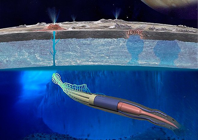 Новый проект NASA направлен на изучение Европы – спутника Юпитера. Об этой планете размером с Луну известно, что она сплошь покрыта слоем льда толщиной от 10 до 30 км, под которым находится море. Учёные не исключают, что там возможны какие-то формы жизни. Чтобы выяснить это, на Европу предполагается отправить аппарат, напоминающий кальмара.