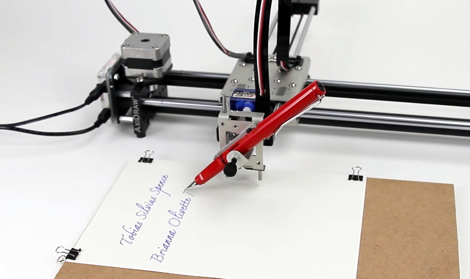 Лаборатория Evil Mad Scientist разработала перьевой плоттер AxiDraw, способный писать каллиграфическим почерком и рисовать на любой плоской поверхности. Плоттер способен использовать перьевые ручки, перманентные маркеры и практически любые другие средства для письма.