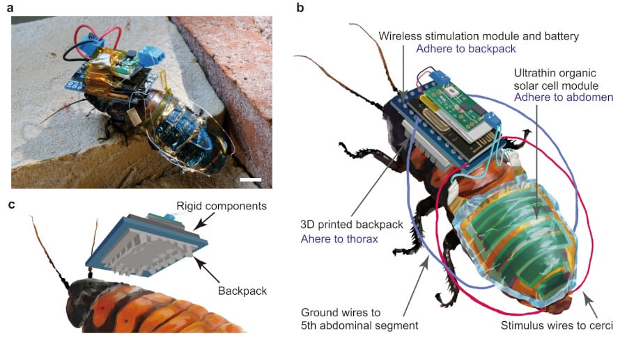 Исследователи создали дистанционно управляемых тараканов-киборгов, оснащенных беспроводным модулем управления, питающимся от аккумулятора, прикрепленного к солнечной батарее. Используемые насекомые, мадагаскарские тараканы (Gromphadorhina portentosa), могут достигать 6-7 сантиметров в длину, поэтому команде пришлось разработать крошечное носимое устройство, содержащее все необходимые компоненты, которое надежно крепилось бы к спине насекомого, не мешая его естественным движениям.