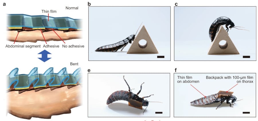 Ранее они испытывали более толстые или равномерно прикрепленные пленки, но тараканам требовалось в два раза больше времени, чтобы преодолеть то же расстояние, и им было трудно выпрямиться, когда они лежали на спине. «Комбинация электроники из ультратонкой пленки и переплетающейся структуры «клейкое — не клейкое» на брюшке насекомого показала более 80% успеха в попытках самовыпрямления«, — сообщают исследователи в журнале .