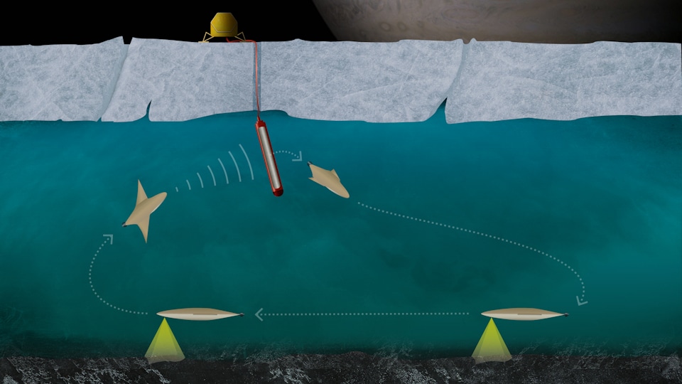 В рамках этой работы исследователи готовят разработку торпедообразного аппарата длиной около 50 см и шириной 10 см, оснащенного сложенными крыльями. Цель состоит в том, чтобы этот аппарат мог пробиваться сквозь лед с помощью теплового зонда, соединенного с наземным посадочным аппаратом.