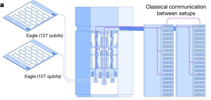 Два QPU в новом исследовании соединены в реальном времени обычной связью. Квантовыми затворами можно управлять классически в рамках динамической схемы, используя состояния измерений в середине схемы во время выполнения задачи. «Наша классическая связь в реальном времени позволяет нам применять квантовые ворота на одном QPU в зависимости от результата измерения на другом QPU», — отмечают исследователи.