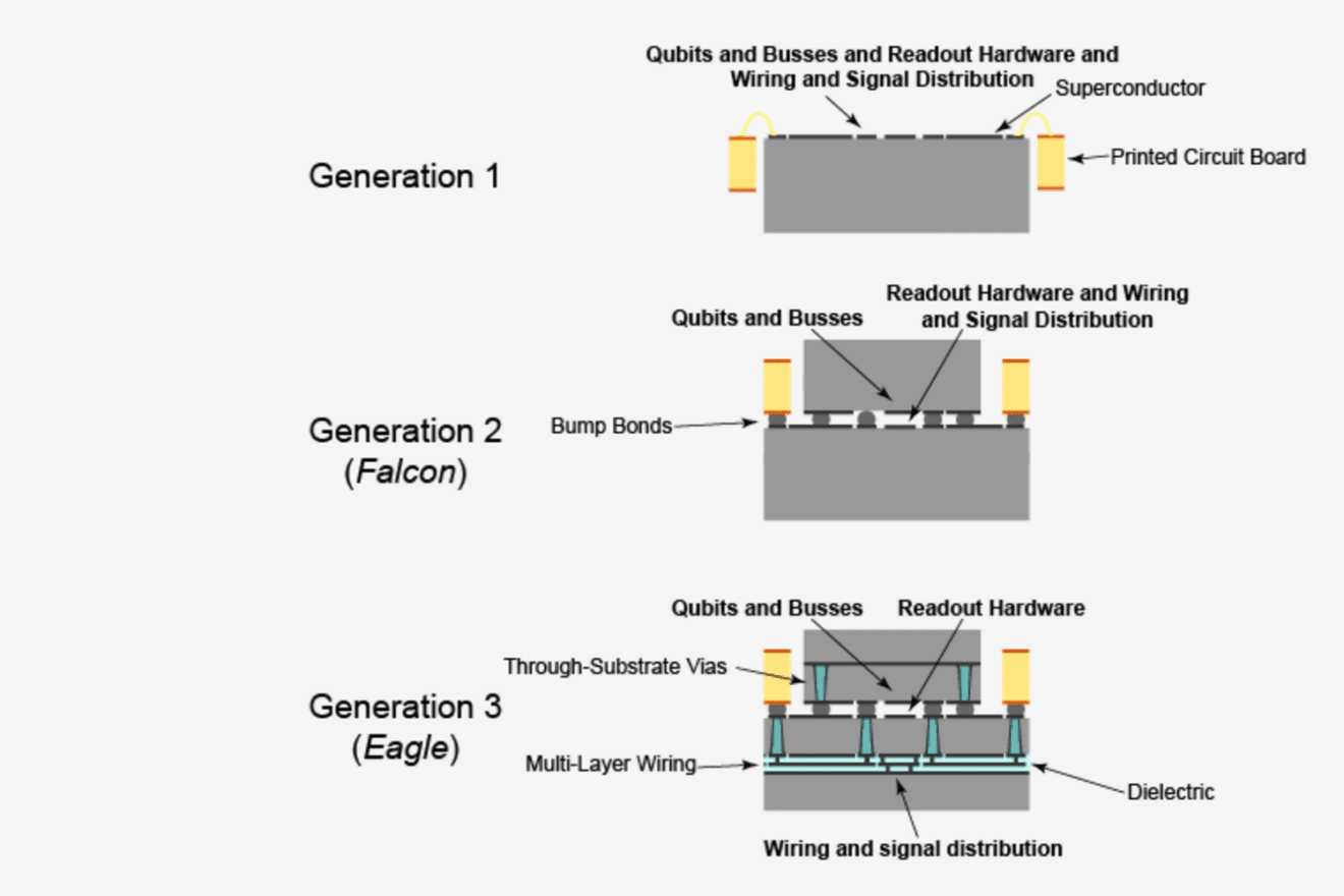 Второе поколение состоит из двух отдельных микросхем, каждая из которых имеет узорчатый слой металла, соединенных пластиной кубита, примыкающей к распорной пластине. Третье поколение включает в себя пластину кубита, связанную с прослойкой с многослойной проводкой. Сигналы управления и считывания проходят через этот дополнительный слой, изоляция которого позволяет передавать сигналы глубоко в большие QPU.