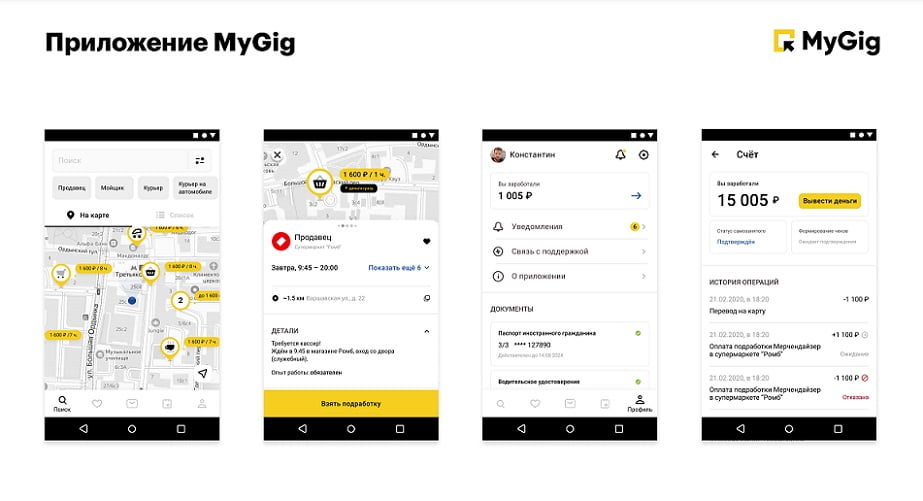 Тестовым вариантом был телеграм-бот для заказчиков и исполнителей. Бот мог принимать заказы, предлагать заказчикам шаблоны для поиска работников. Если ботом пользовался исполнитель, то он регистрировался, добавлял реквизиты и шел подрабатывать. Мы поняли, что идея рабочая и есть потенциал, поэтому стали разрабатывать веб-приложение MyGig, которое повторяло все функции бота, а потом и мобильное приложение.