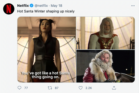 В Twitter сервис Netflix публикует анонсы, осуществляет клиентскую поддержку и взаимодействует с пользователями при помощи мемов. Например, чтобы поделиться тематической шуткой со своей аудиторией, Netflix соединил в меме два сериала («Наследие Юпитера» и «Рождественские хроники»).