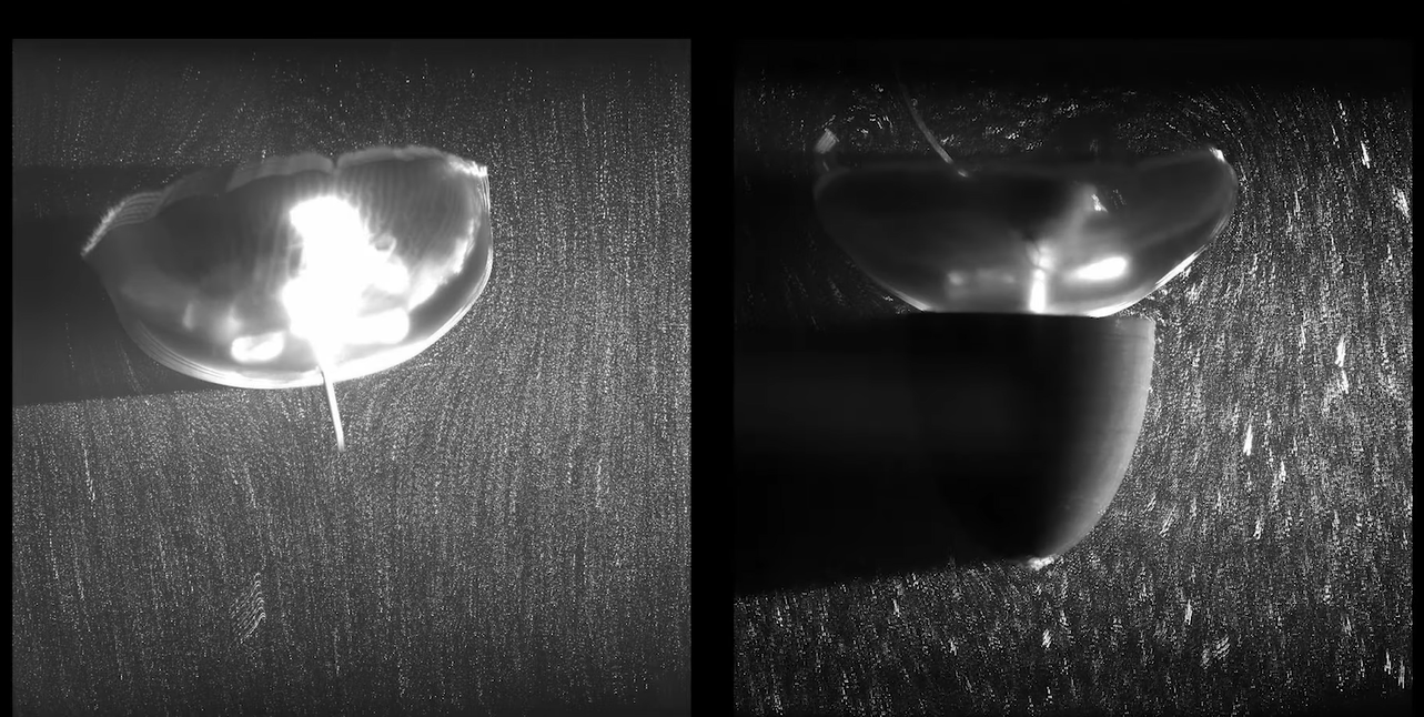 Исследователи работали над устройством, похожим на сердечный имплантат, чтобы повысить скорость плавания. Однако для достижения еще большей эффективности было добавлено еще одно устройство: своего рода 3D-печатный колпак, называемый «передним телом». Действуя подобно носу корабля, этот объект снижает сопротивление воды. Медузы-киборги были протестированы в специально разработанном вертикальном аквариуме. Согласно полученным результатам, дополненные медузы плавали в 4,5 раза быстрее, чем их обычные собратья.