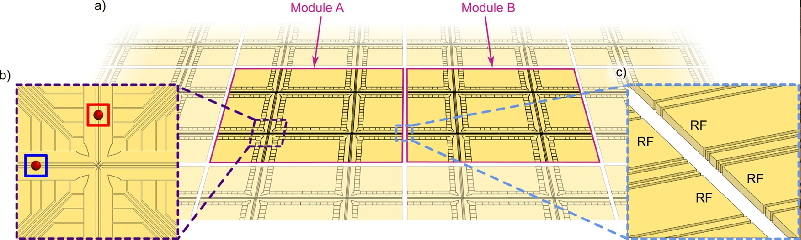 a) Два модуля («Модуль A» и «Модуль B») показаны как полностью непрозрачные, а части десяти других модулей показаны как частично прозрачные. В качестве примера, каждый модуль содержит 4 X-перехода и структурирован таким образом, что он пересекается с соседними модулями. Реалистичная реализация может иметь гораздо больше Х-переходов на модуль. На панели b) показан один Х-переход на модуле. В этой архитектуре определенные области Х-перехода связаны с определенными функциями и соединены подвижными ионами. Например, один кубит может быть расположен в области затвора для операций квантовой логики (синяя рамка), в то время как другой кубит может быть сохранен или перемещен в область памяти (красная рамка). На панели c) показано пространство между модулями. Отдельные пары радиочастотных электродов простираются до края модулей для создания радиального удерживающего потенциала для переноса ионов в соседний модуль.