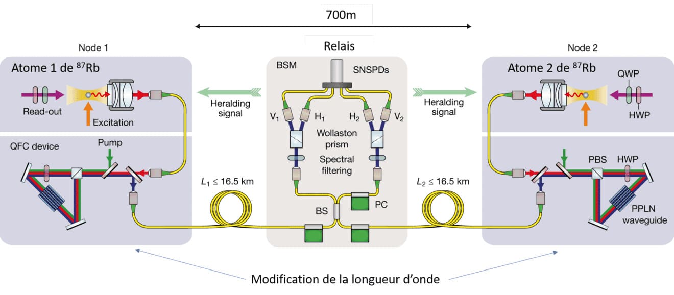 Каждый атом был возбужден лазерным импульсом, что заставило их испустить квантово запутанный фотон вместе с атомом. Другими словами, это фотонная запутанность с изюминкой, когда в смесь добавляется атомный материал для повышения эффективности, надежности и стабильности. Затем фотоны отправляются по оптоволоконным кабелям и встречаются на приемной станции в центре (реле). Там фотоны подвергаются совместному измерению, которое запутывает их — и поскольку каждый из них уже запутан со своим атомом, два атома также становятся запутанными друг с другом. Таким образом, информация не теряется и достигает другого конца кабеля.