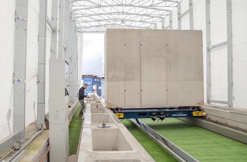 Блоки хранятся в огромном прямоугольном здании, каждый размером 3,5 x 2,7 x 1,3 метра и весом 24 тонны. Они на 99% состоят из спрессованной земли, смешанной с водой и полимерами для стабилизации, и в итоге по плотности почти не уступают бетону. Рельсовая система доставляет их к лифту и обратно: каждый блок спускается со скоростью около 2 м/с, производя около одного мегаватта, по словам Марко Терруццина, инженера-механика и менеджера по коммерческим продуктам Energy Vault.