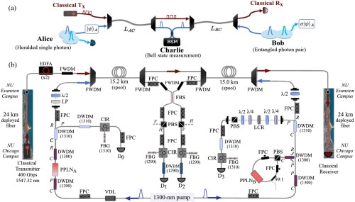 Волоконная оптика — основная инфраструктура, используемая для создания сетей квантовой связи. Однако большинство существующих инфраструктур уже загромождены миллионами бит обычного интернет-трафика. Многие исследователи полагали, что осуществить квантовую телепортацию через существующие инфраструктуры невозможно, поскольку запутанные фотоны будут «утоплены» среди миллионов классических фотонов. Это все равно что ехать на велосипеде по туннелю, переполненному грузовиками, несущимися на большой скорости.
