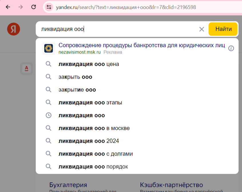 Однозначно сказать, что пользователь ищет юридические услуги – нельзя. Он может интересоваться терминологией, судебной практикой или основаниями, на которых может быть ликвидирована фирма. Однако ему и в поисковой выдаче и даже до момента нажатия на кнопку «Найти» навязывают рекламу.
