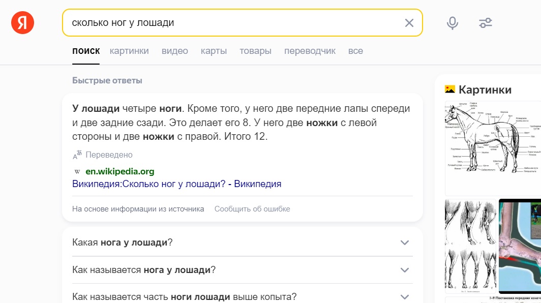 Мем поиска — сколько ног у лошади? Чему Яндекс учит детей и не только детей