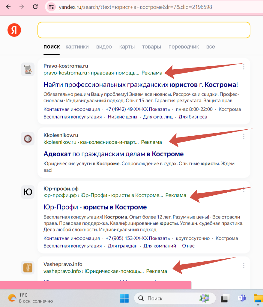 Некачественные ответы на информационные запросы пользователей – это полбеды. К ним добавляются и сомнительные поисковые результаты на запросы коммерческие, когда пользователь ищет товар или услугу. Например, по запросу «юрист в Костроме» сайт реальной юридической службы появляется только на шестом (!) экране скроллинга – и это на ноутбуке с хорошим разрешением.