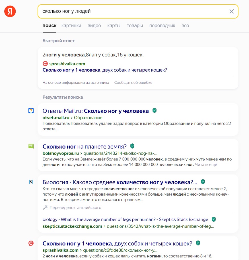 В итоге, если мы сделаем запрос в Яндексе — сколько ног у людей. Получим неожиданную дополнительную информацию — 2ноги у человека,8лап у собак,16 у кошек.